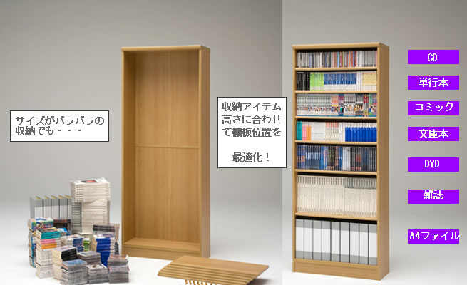 棚板を自由に設置できるから、無駄のない収納が実現します。
